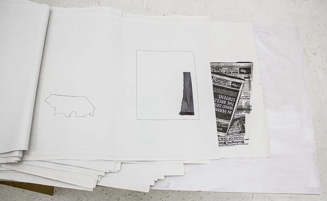 The Thousand-paged, collectively-read Newspaper is an interactive sculptural work which combines landscape and publication. I visited Vermont during it's bleak "mud-season" to interview staff at the Burlington Free press and to travel the countryside, documenting its wooded vastness. The paper’s content includes poetry that evokes the sense of isolation engendered in a rural context, alongside drawings of sheds and other hand-built backyard constructions: decapitated objects floating solitary and fragmented throughout the thousand pages. The sparse layout mirrors that of any northern U.S. inhabited rural landscape. When a viewer leafs through what may seem an endless grayness, they discover printed, drawn and collaged visual and text content. No single viewer could likely read through the whole piece in a sitting, so the paper is collectively read.